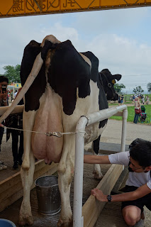 そして「乳搾り体験」。時間になると二頭の牛がつながれ、その後ろにお客さんがずらっと並んで、牛の乳搾りに挑戦できる。「乳を絞る」行為のためにかなりの人数の人が列をなすという光景に一抹の滑稽さを覚えながらも、私達も参加した。