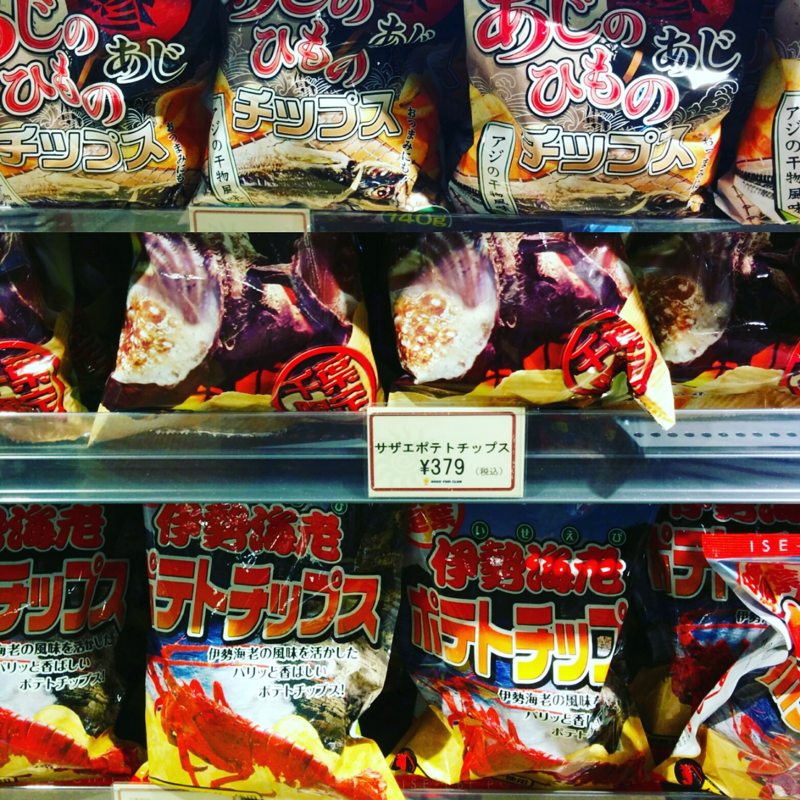 あじの干物、サザエ、伊勢海老味のポテトチップスも売っている。買わず。