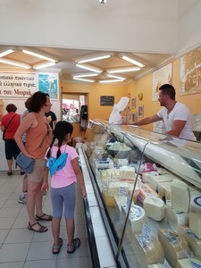 市場の建物から道を渡ったところにあるチーズ屋。子供はマリーナさんにべったりw チーズ屋の兄ちゃんにもかまってもらう。